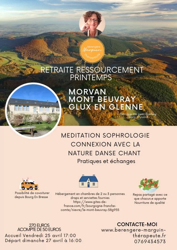 Se ressourcer mentalement pendant une retraite de ressourcement dans le Morvan avec Bérengère Marguin , qui vous guidera par des pratiques de respiration et de chant à relâcher les tensions pour vous ressourcer du 25 au 27 avril à Glux en Glenne dans le Morvan au Gîte Mont Beuvray